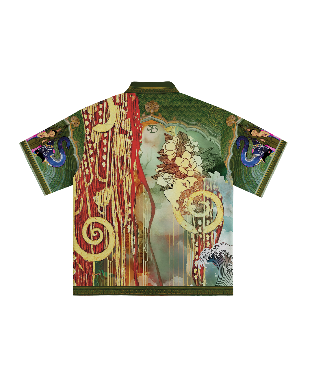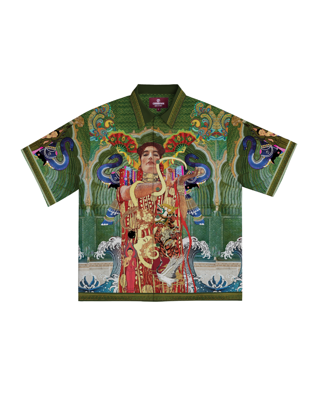 A vibrant green shirt, a tribute to Gustav Klimt’s ‘Hygieia,’ reinterpreted through the lens of a rich, brown perspective. This exquisite artwork embodies the duality of human emotions, seamlessly merging Indian and European aesthetics into a masterpiece of cultural elegance and artistic grandeur.