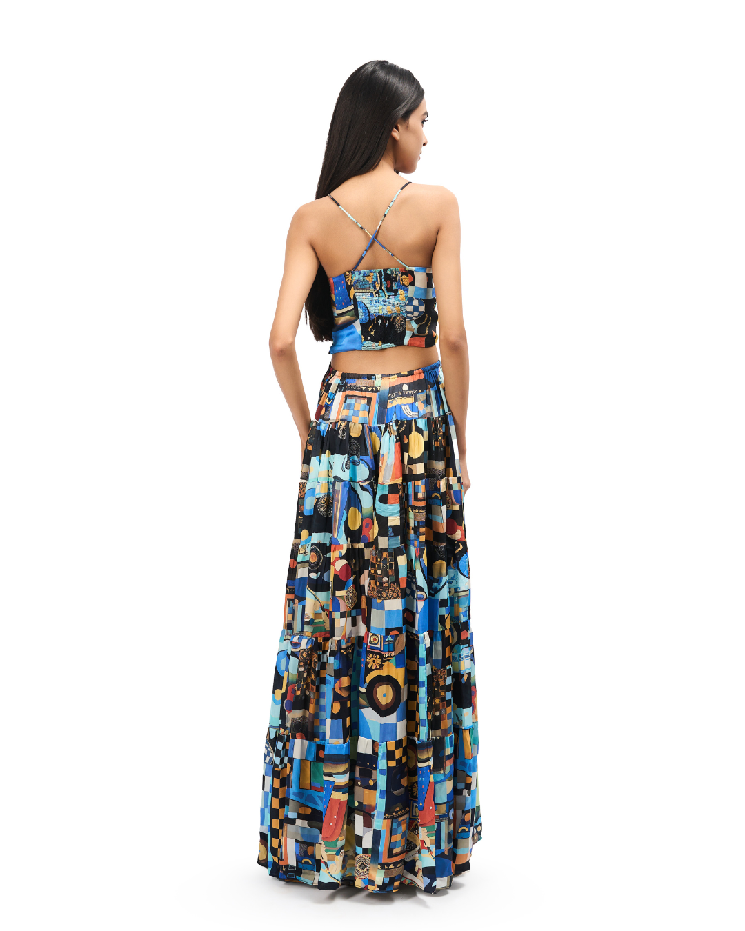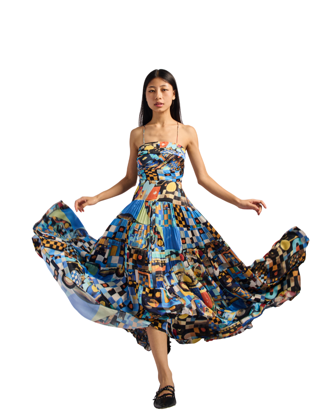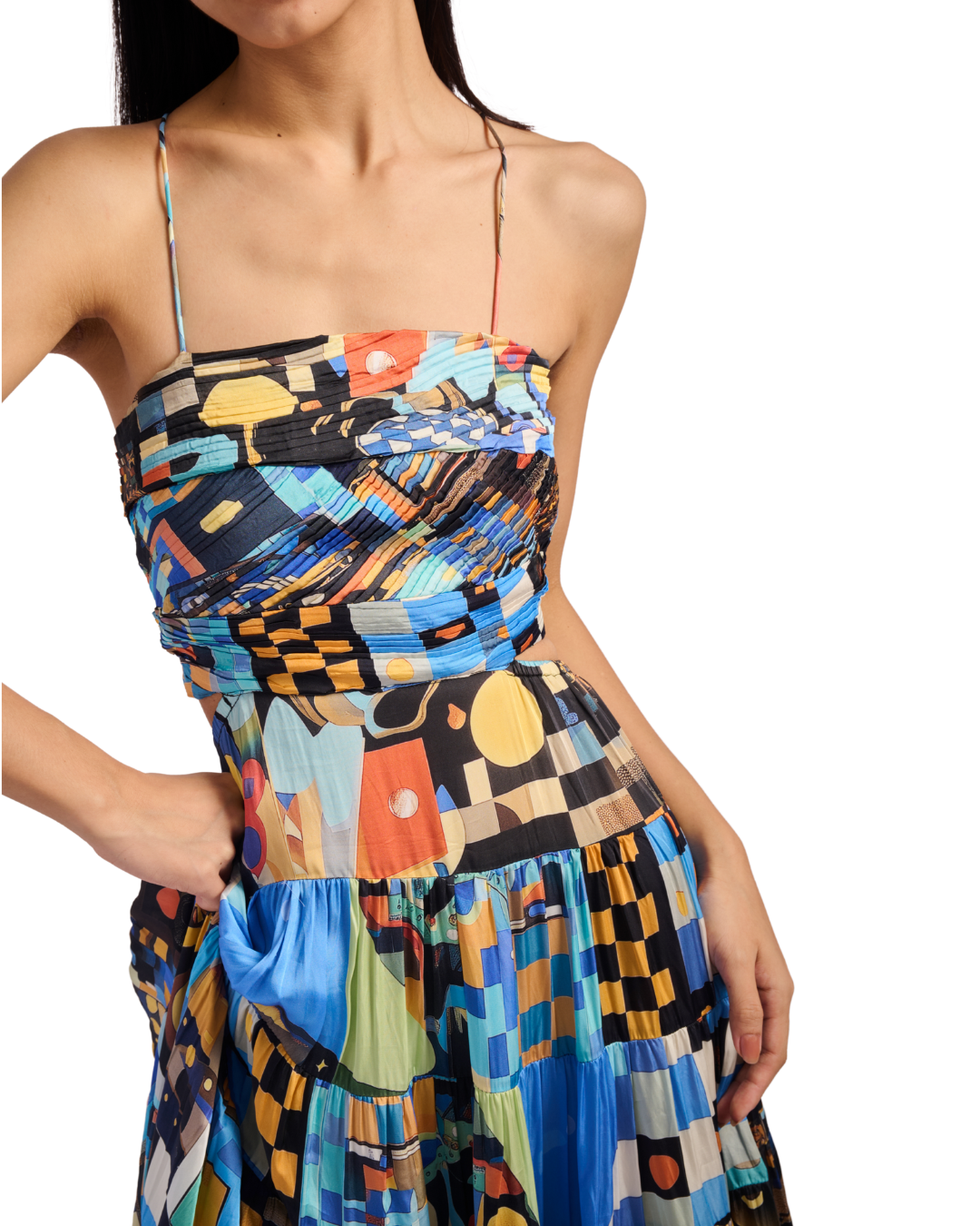 Our Abstract printed multicoloured tiered dress features a ruched bodice for a sculpted fit, complemented by a shirred back panel for added flexibility. Clean cut-outs at the waist and back bring a defined structure to the silhouette, while the flared, multi-tiered skirt adds fluidity and movement. Whether you’re headed to a soirée or a sundown celebration, this piece is gonna turn heads!