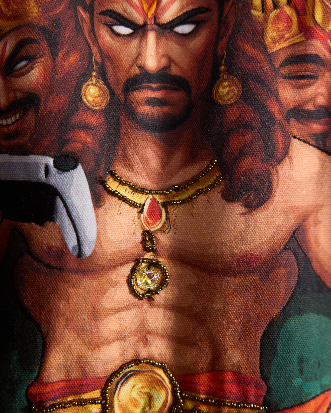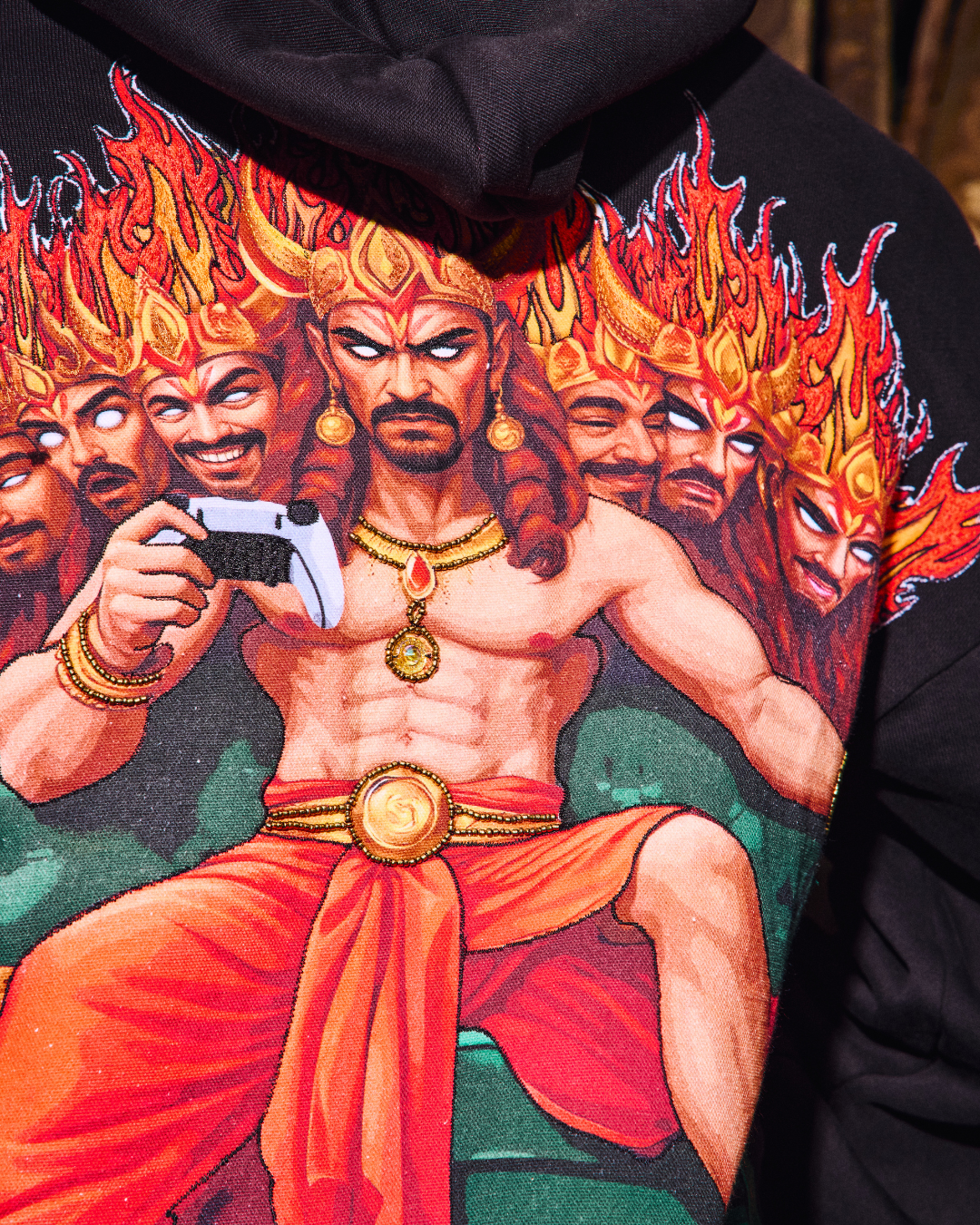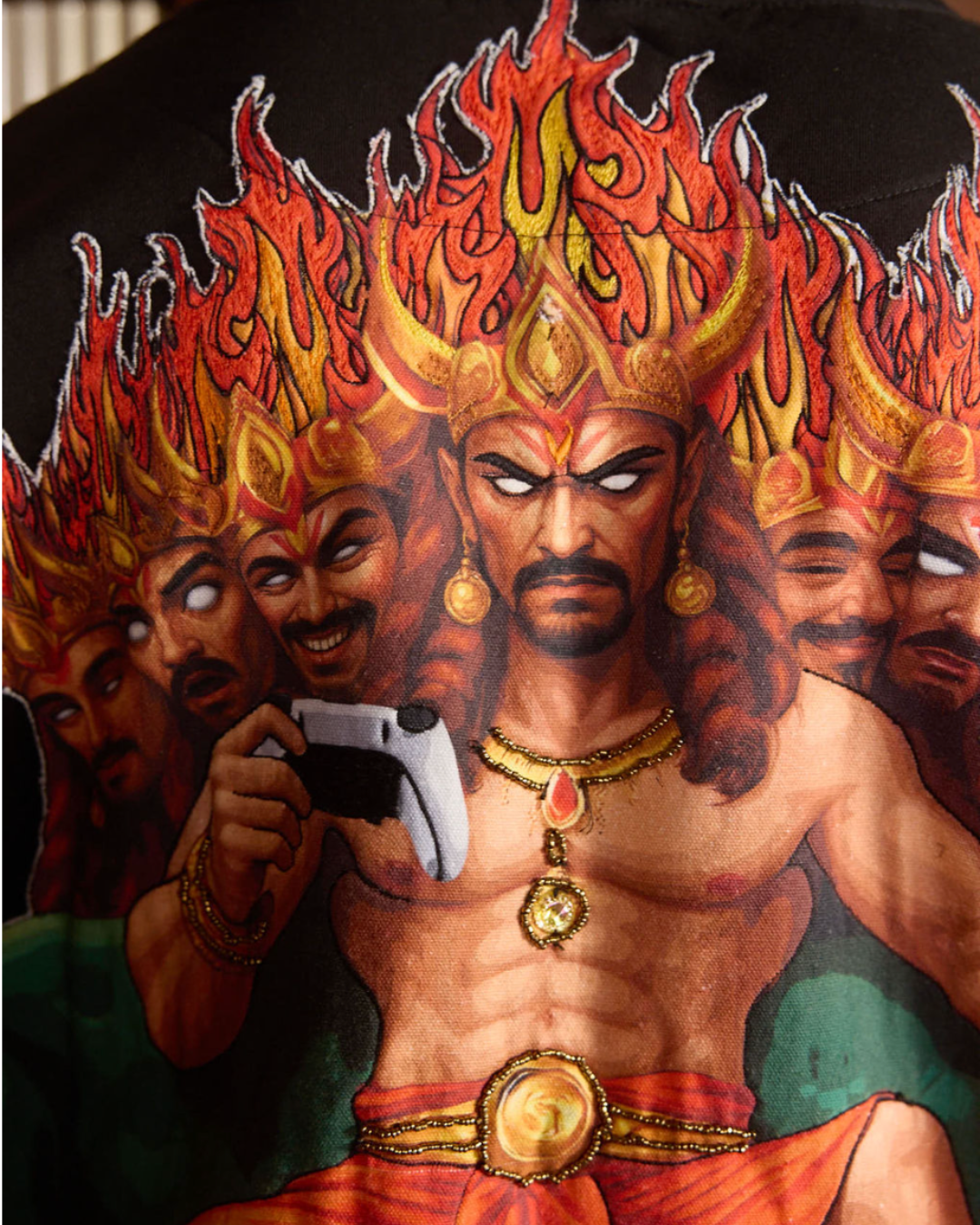 Thread-embroidered Fire patchwork on Raavan